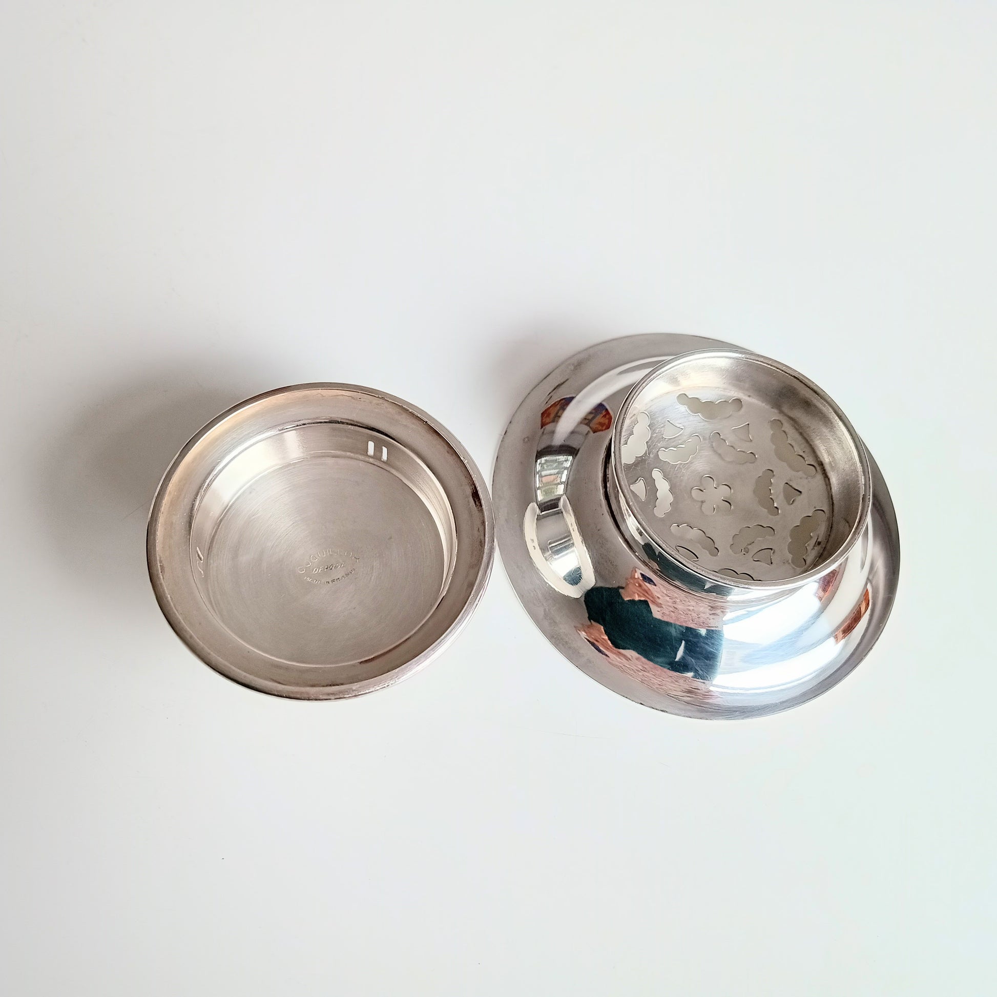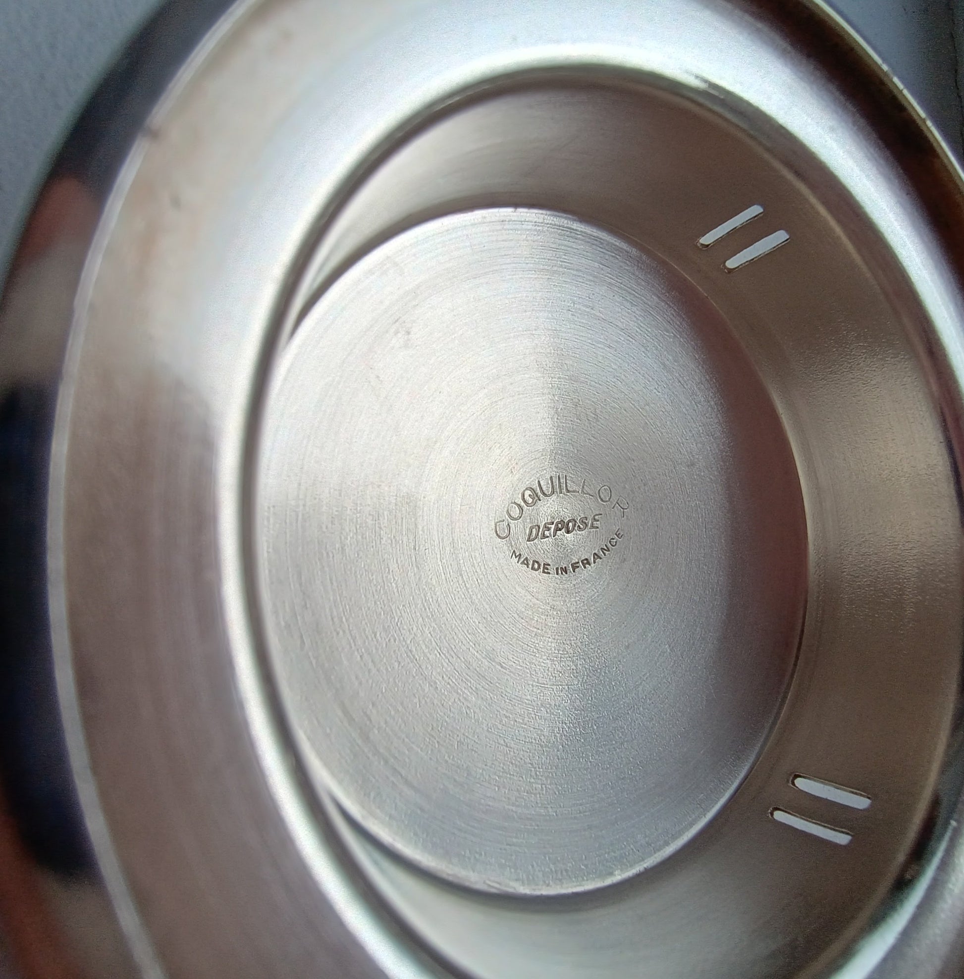 Authentic French two part butter curler dish, signed to the underside Coquillor Depose made in France. Also signed with maker marks JL and 4g (silver plating) to foot.