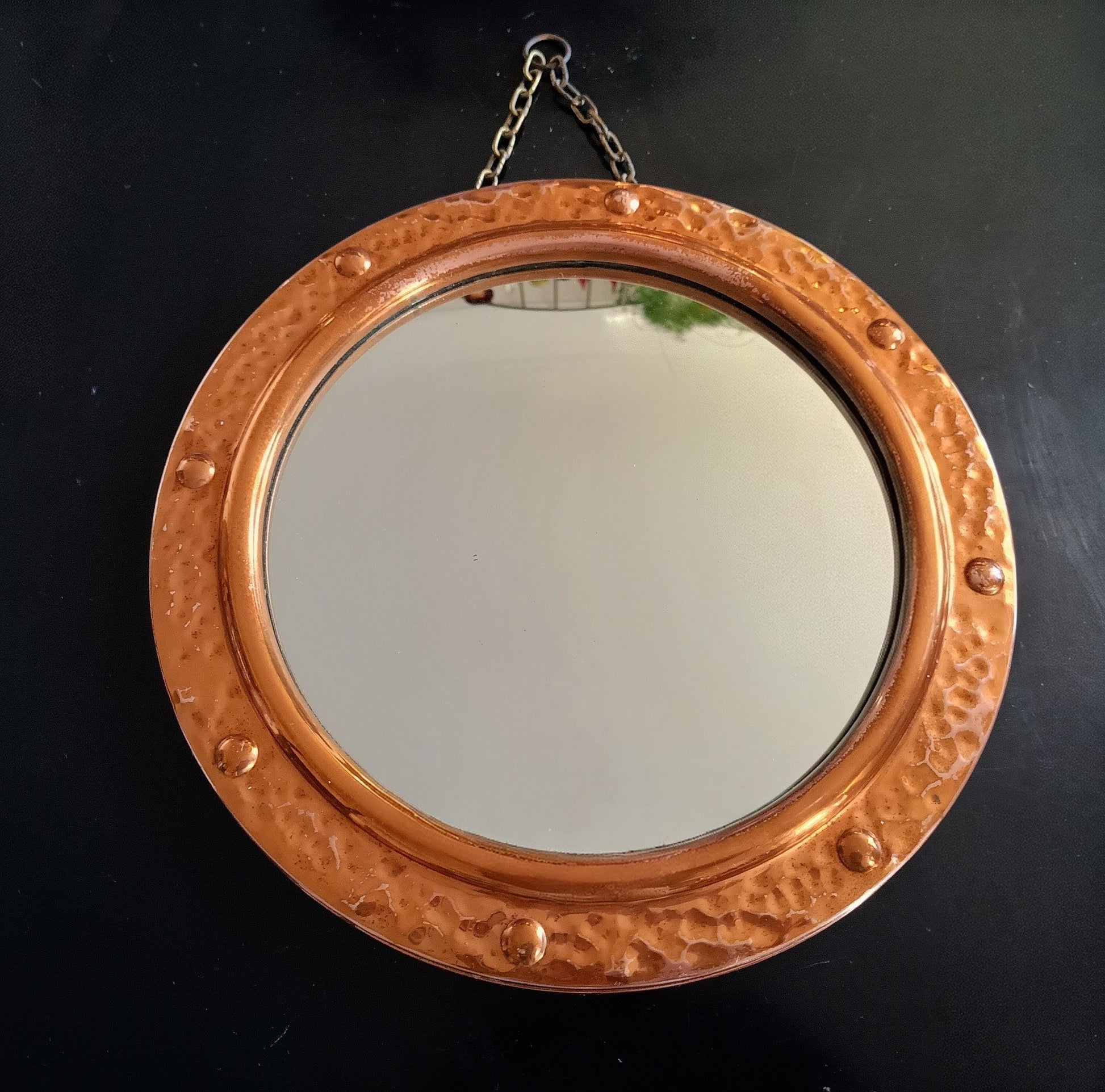 Stylish Vintage English Hammered Copper mirror in the style of nautical porthole, made in the 1950s. The mirror itself has slightly convex surface. Riveted around the edge.