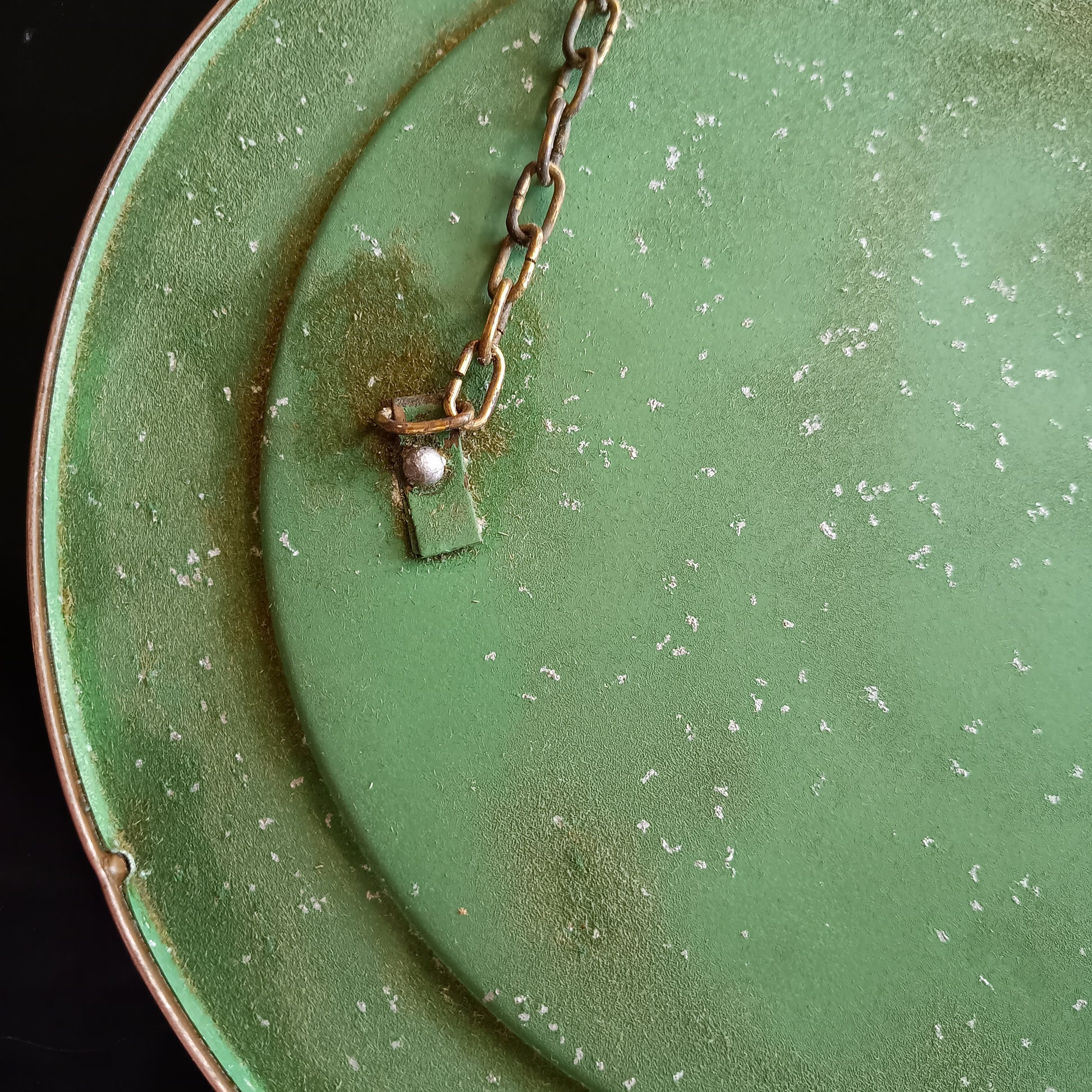 Dimensions are: Diameter 26 cm, height including the hanging chain is about 35 cm, the frame width is about 3.5 cm.