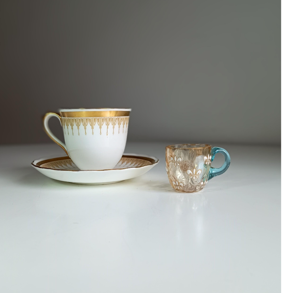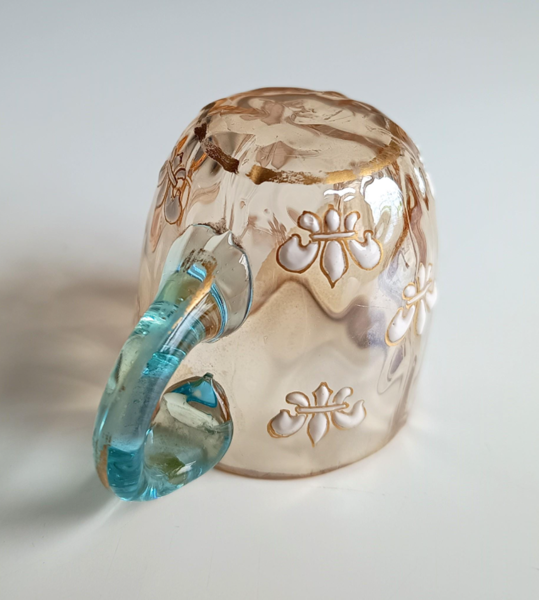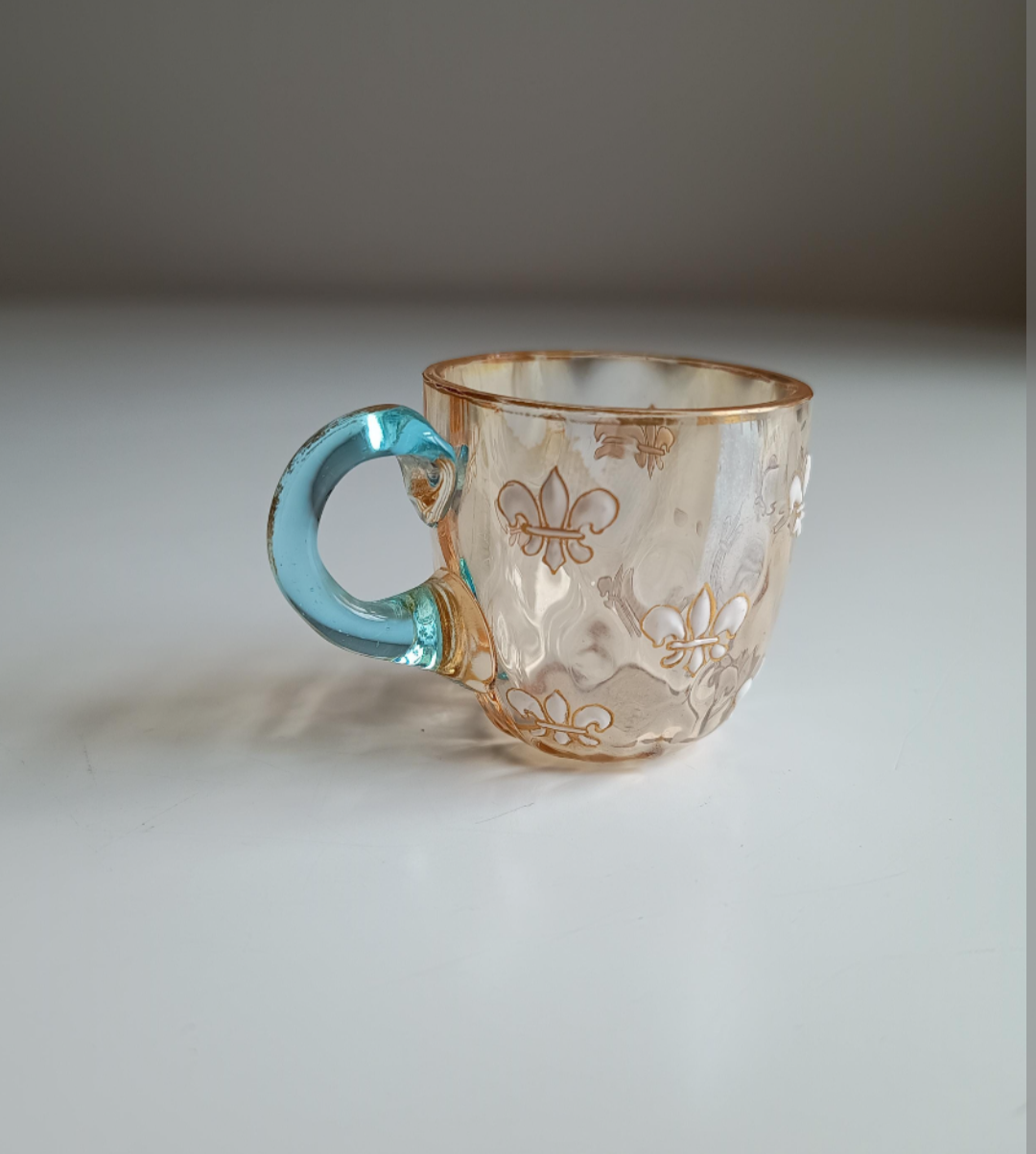 Finely crafted French Art Nouveau liqueur glass cup, c. 1885–1895. Wavy glass texture. Light cobalt handle, enamelled with thick paste: fleur-de-lis with gold rim, polished pontil with micro dip where it snapped, exhibiting manganese UV fluorescence. Decor pâte‑sur‑pâte fleur-de-lis dorée. Gold cream paste enamelling - rare quality item. Attributed to Pantin before Montjoyes acquisition, or early Montjoye Legras. Mold blown with optic texture. Pantin-style fluorescence in UV light.