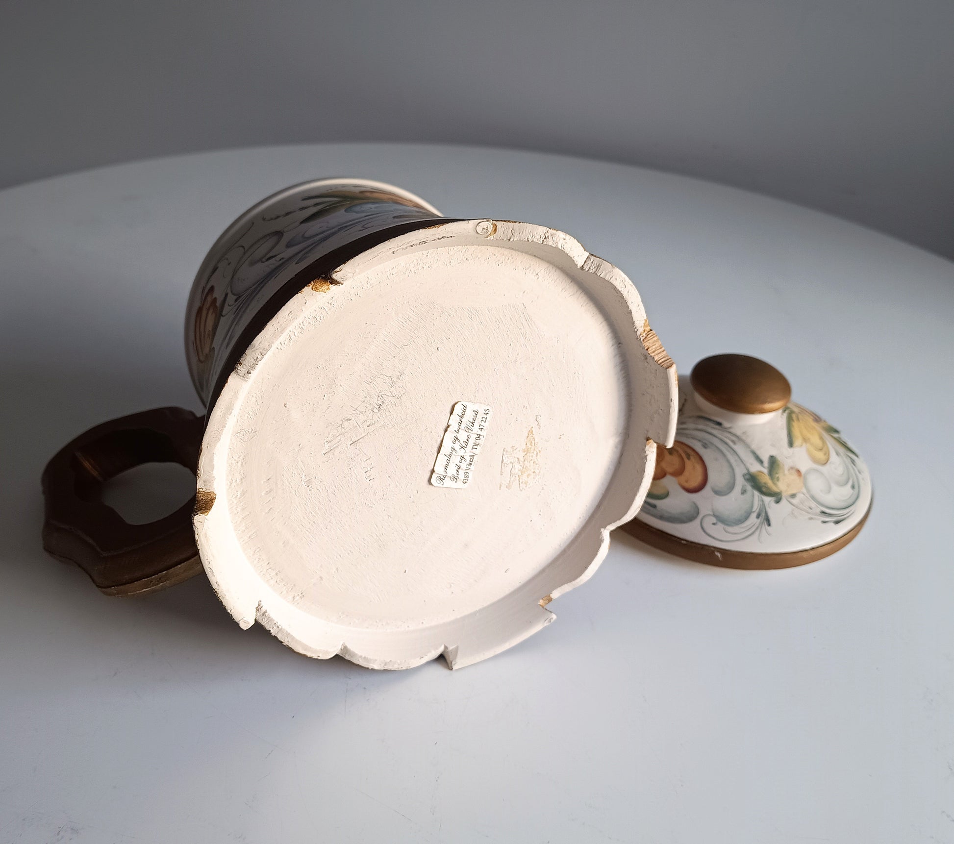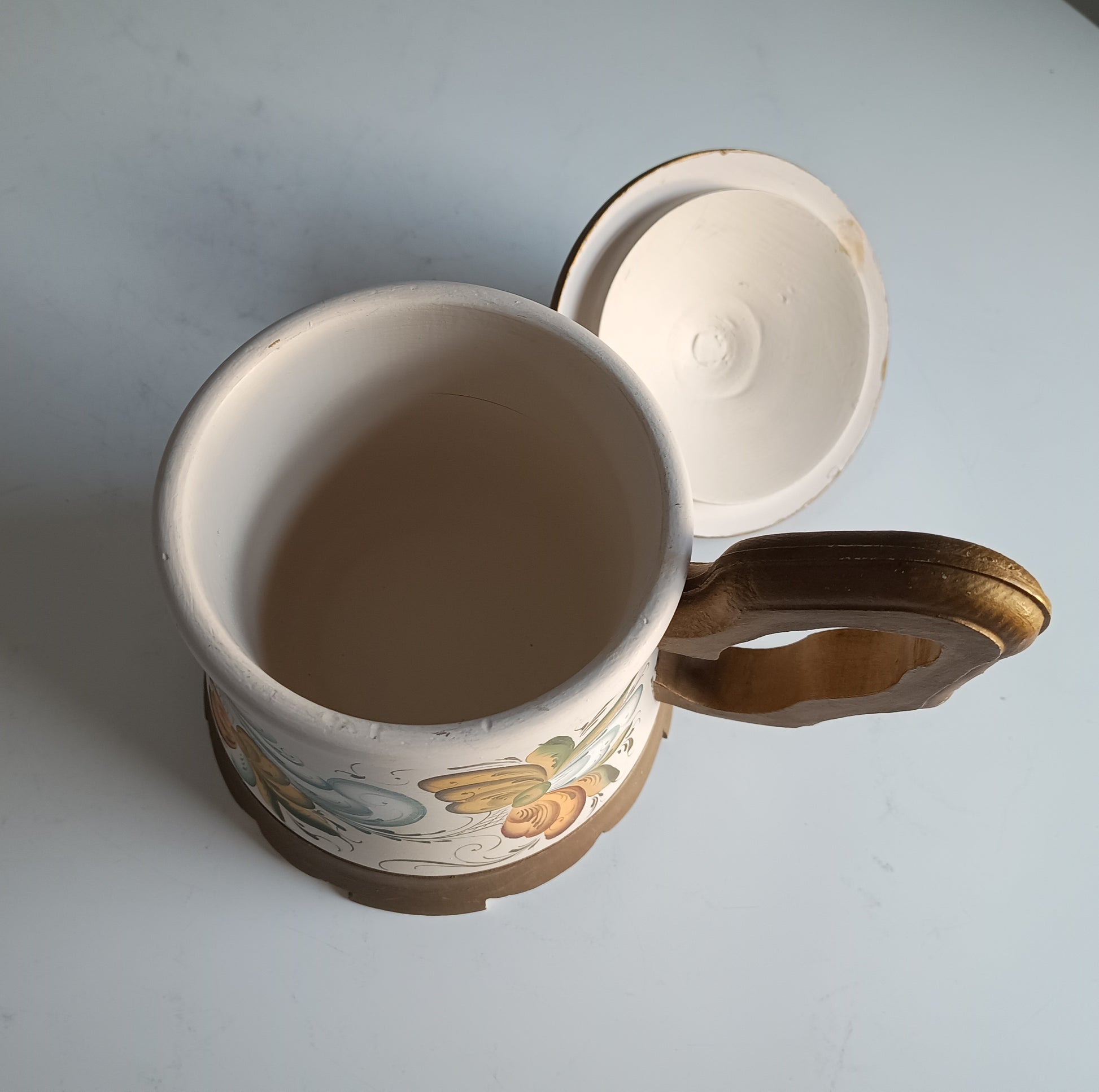 Condition is good, there is a scratch on the side and bites on the underside, which are not visible when displayed. The tankard is clean, well made and nicely painted - great to use as part of cottage decor or to store your kitchen utensils.