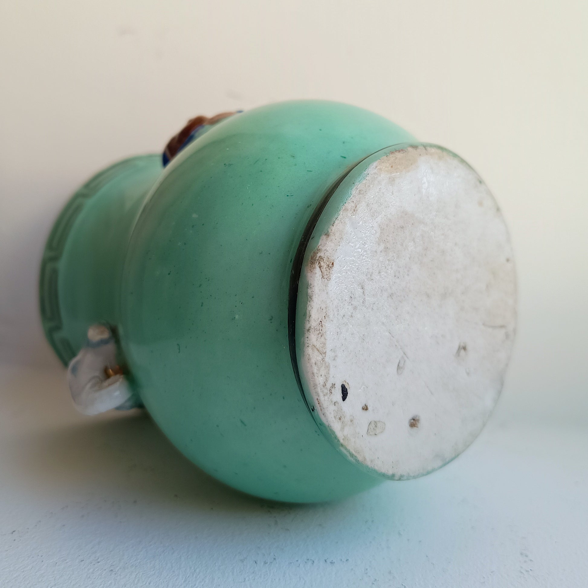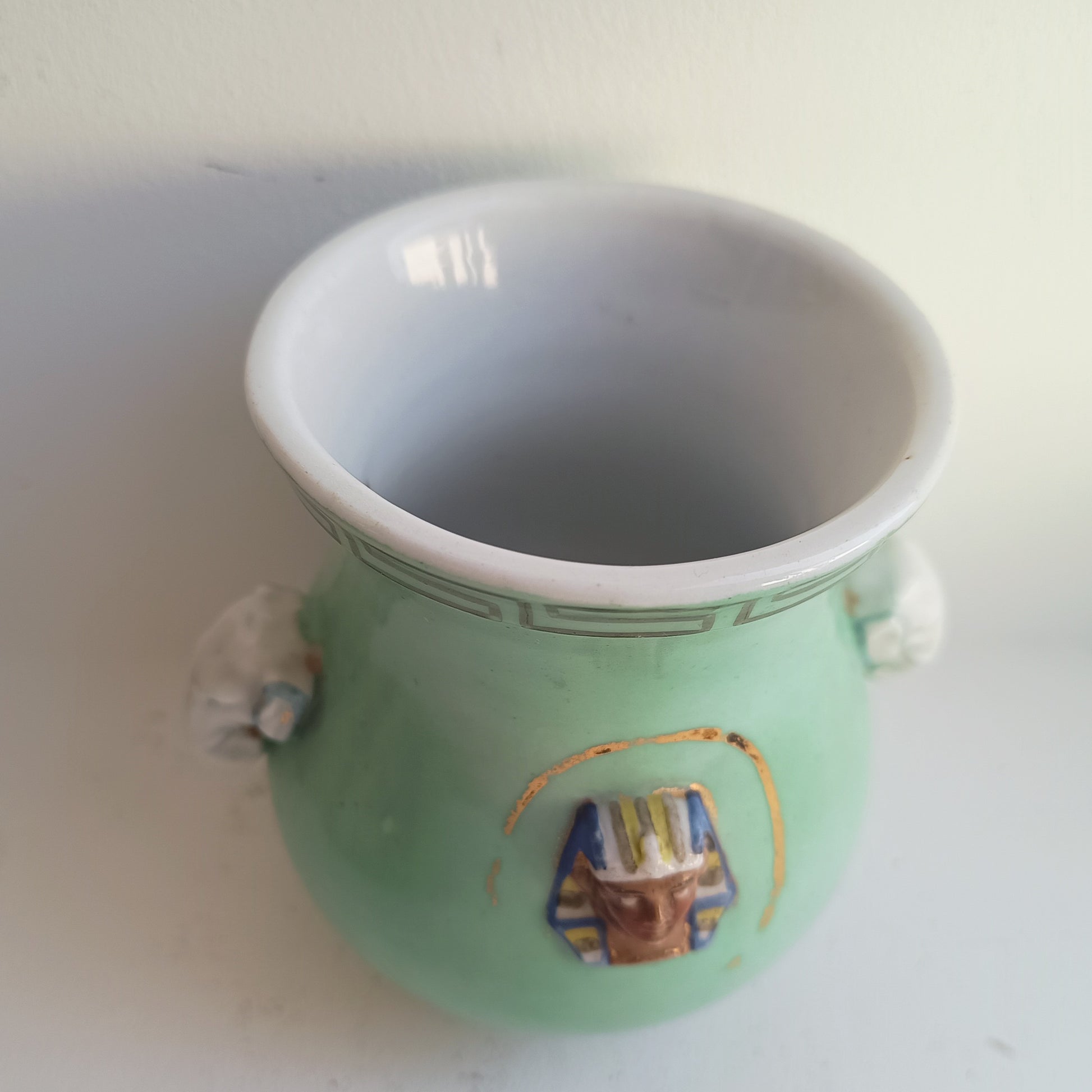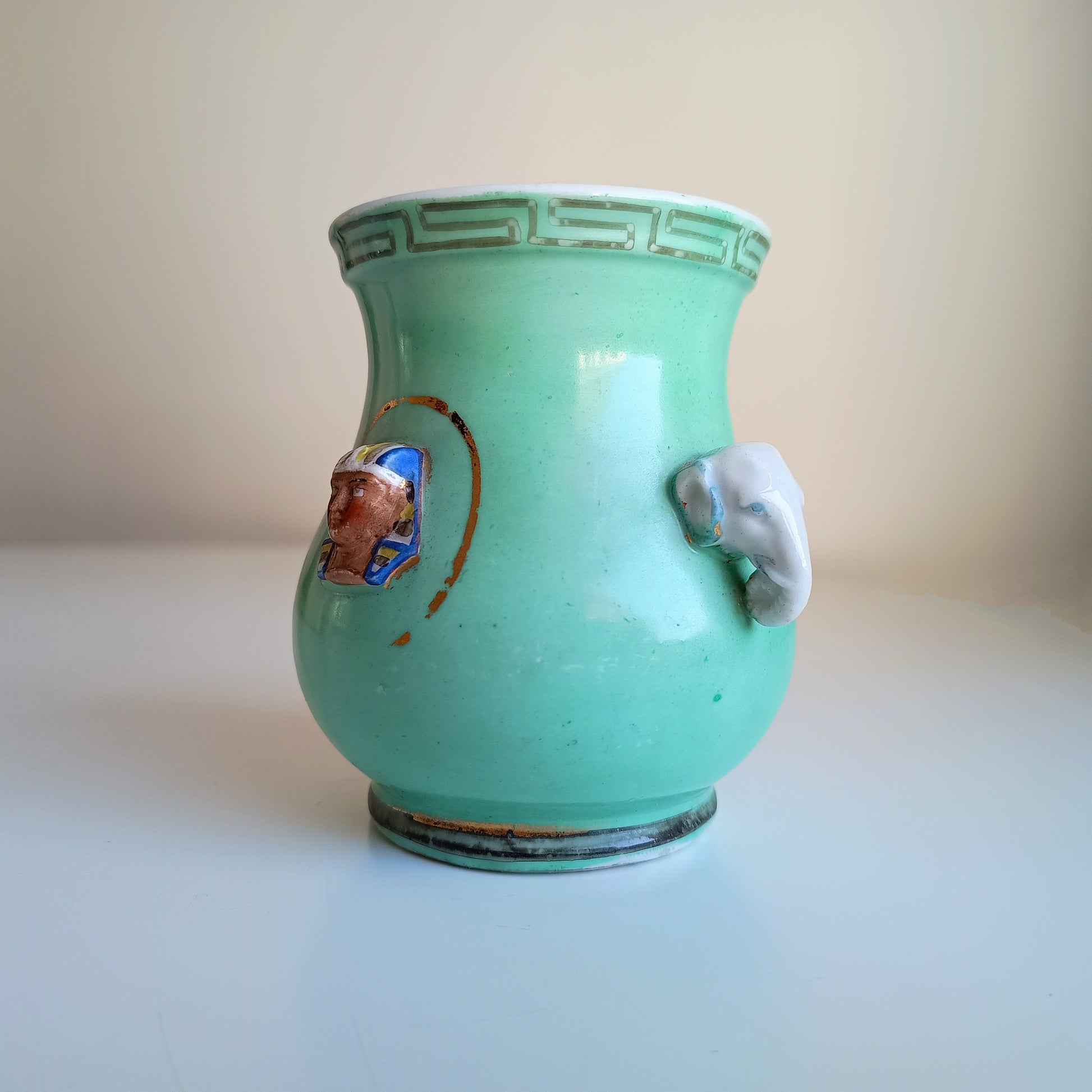 Vintage Novelty Pharaoh Applique Elephant Handles Match Holder Hu Vase Celadon Glaze European 1890-1920 in the style of George Jones Pottery