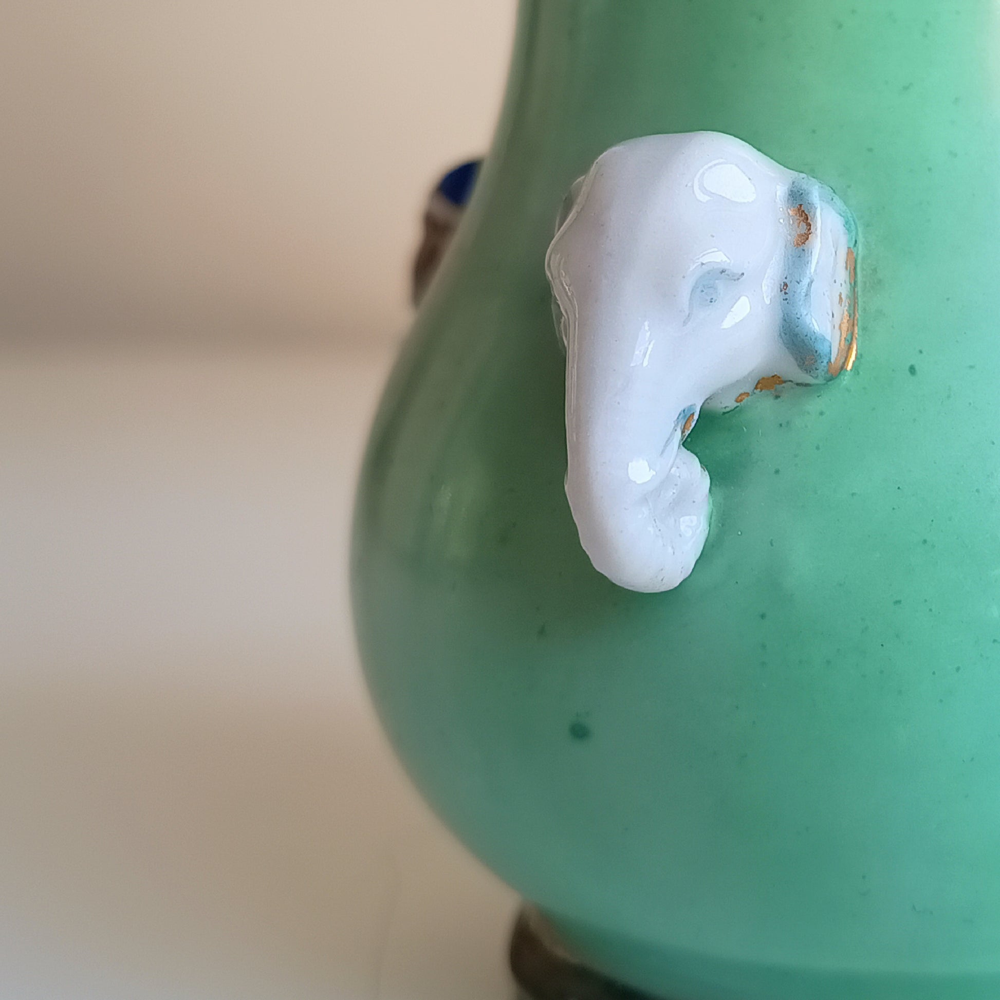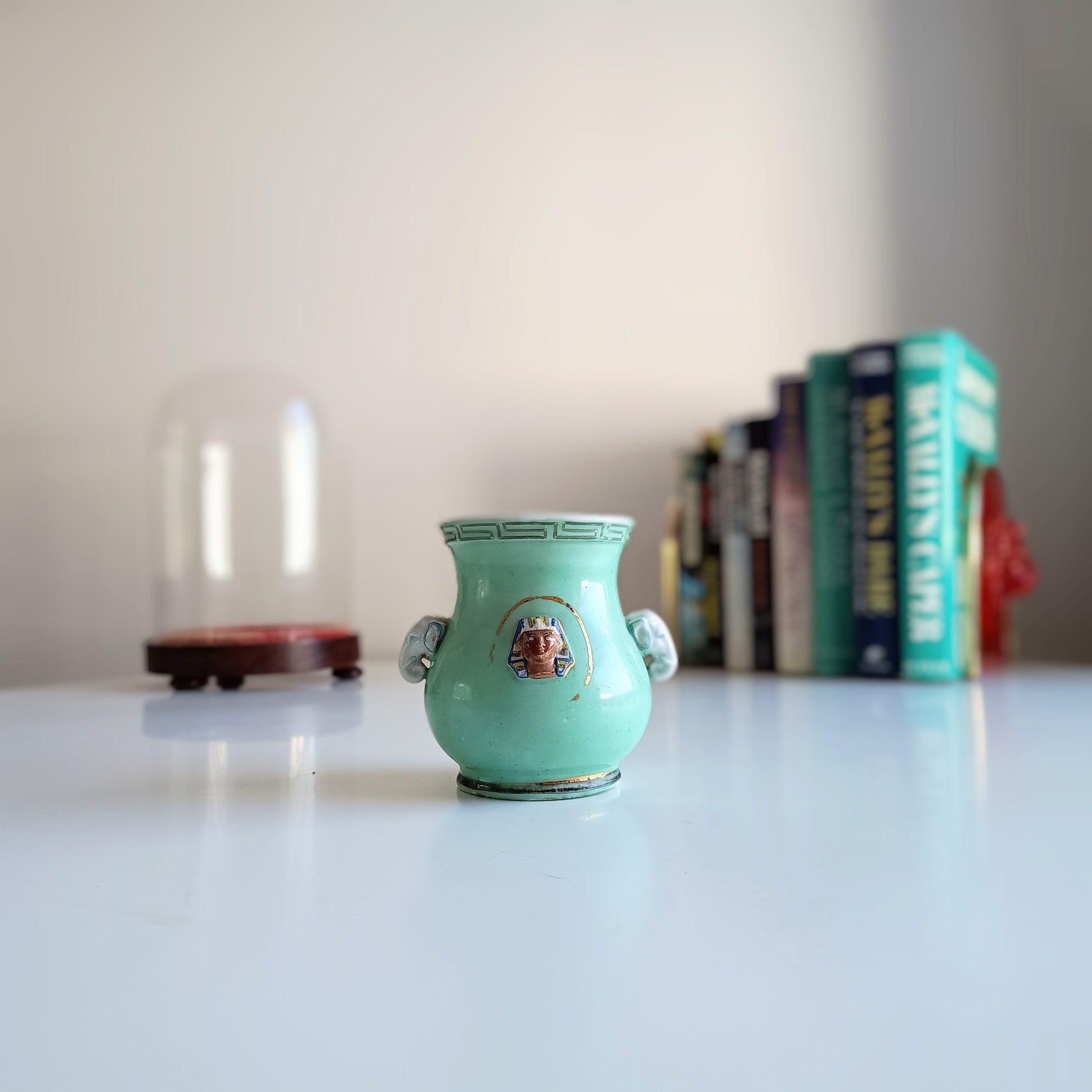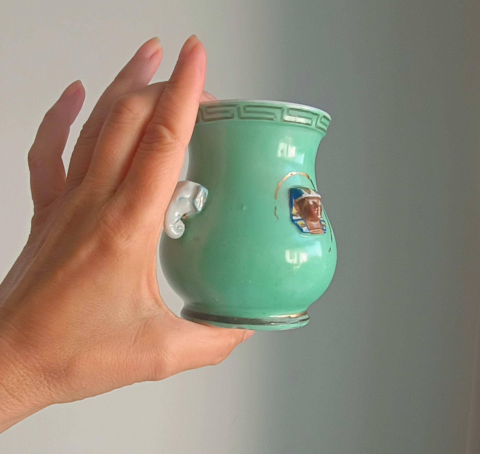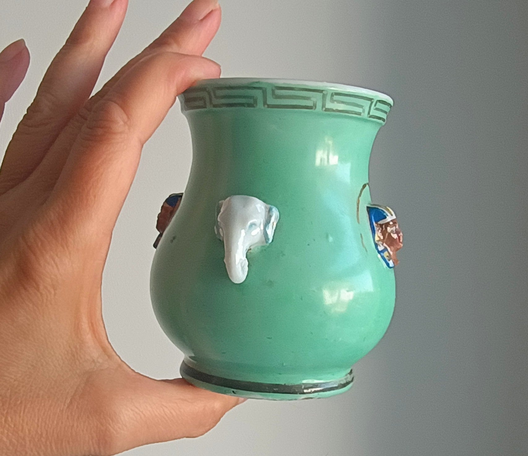 Vintage Novelty Pharaoh Applique Elephant Handles Match Holder Hu Vase Celadon Glaze European 1890-1920 in the style of George Jones Pottery