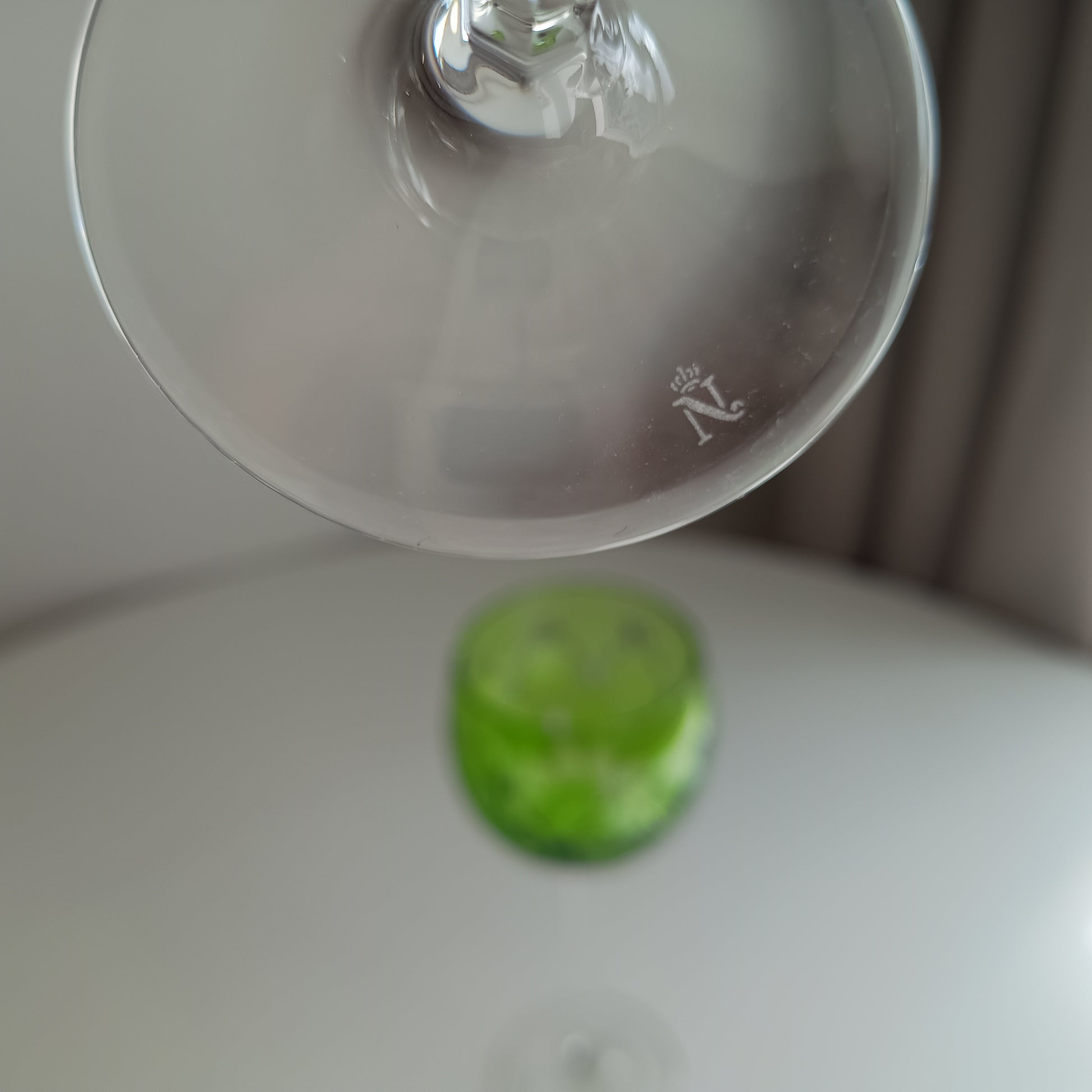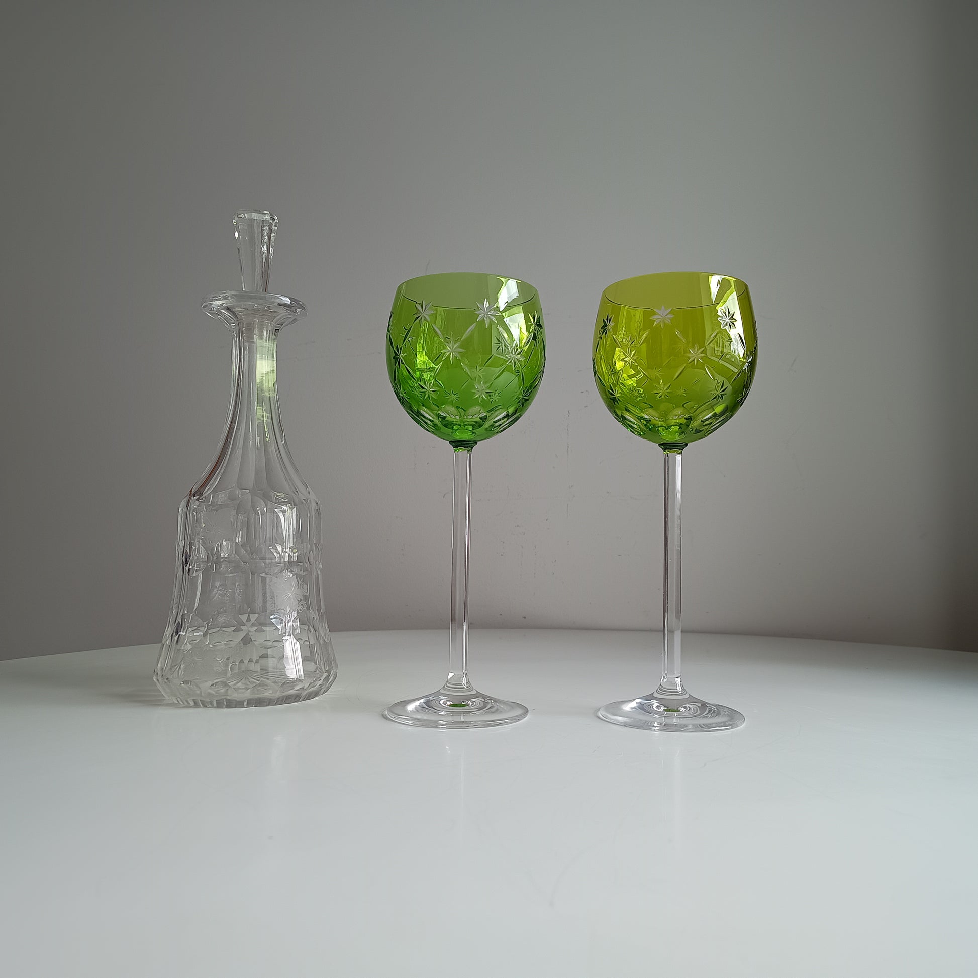 Please note that as these are handcrafted, there is a subtle and beautiful difference in the green hue between the two glasses—one leans slightly more toward a warmer chartreuse / olive green tone than the other. This variation is a hallmark of authentic, hand-cased vintage crystal and adds a unique, artisanal character to the set.