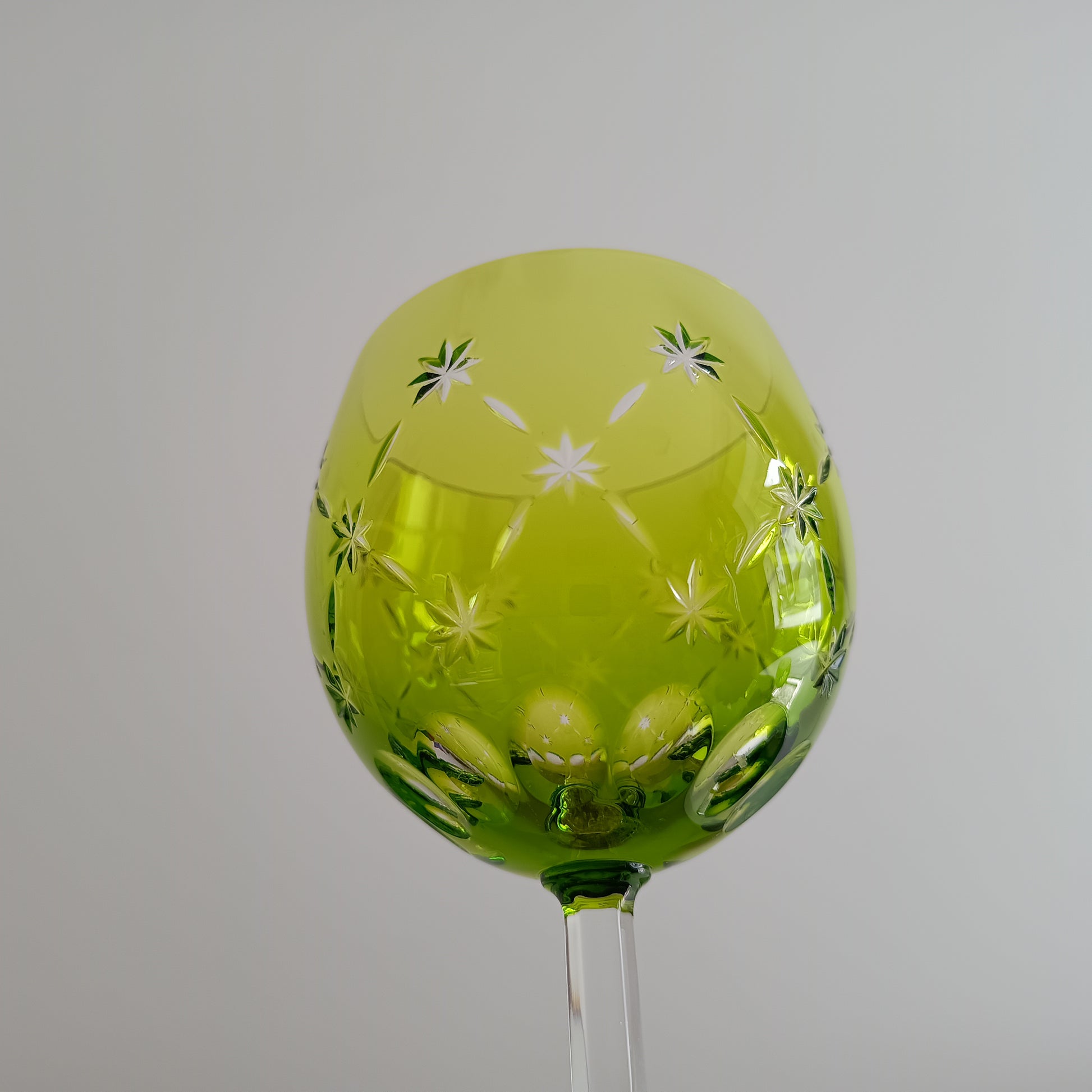 Hand-cut and mouth-blown in Bavaria, these glasses feature a vibrant "Reseda" or Chartreuse Green casing cut away to reveal the brilliant clear crystal beneath.