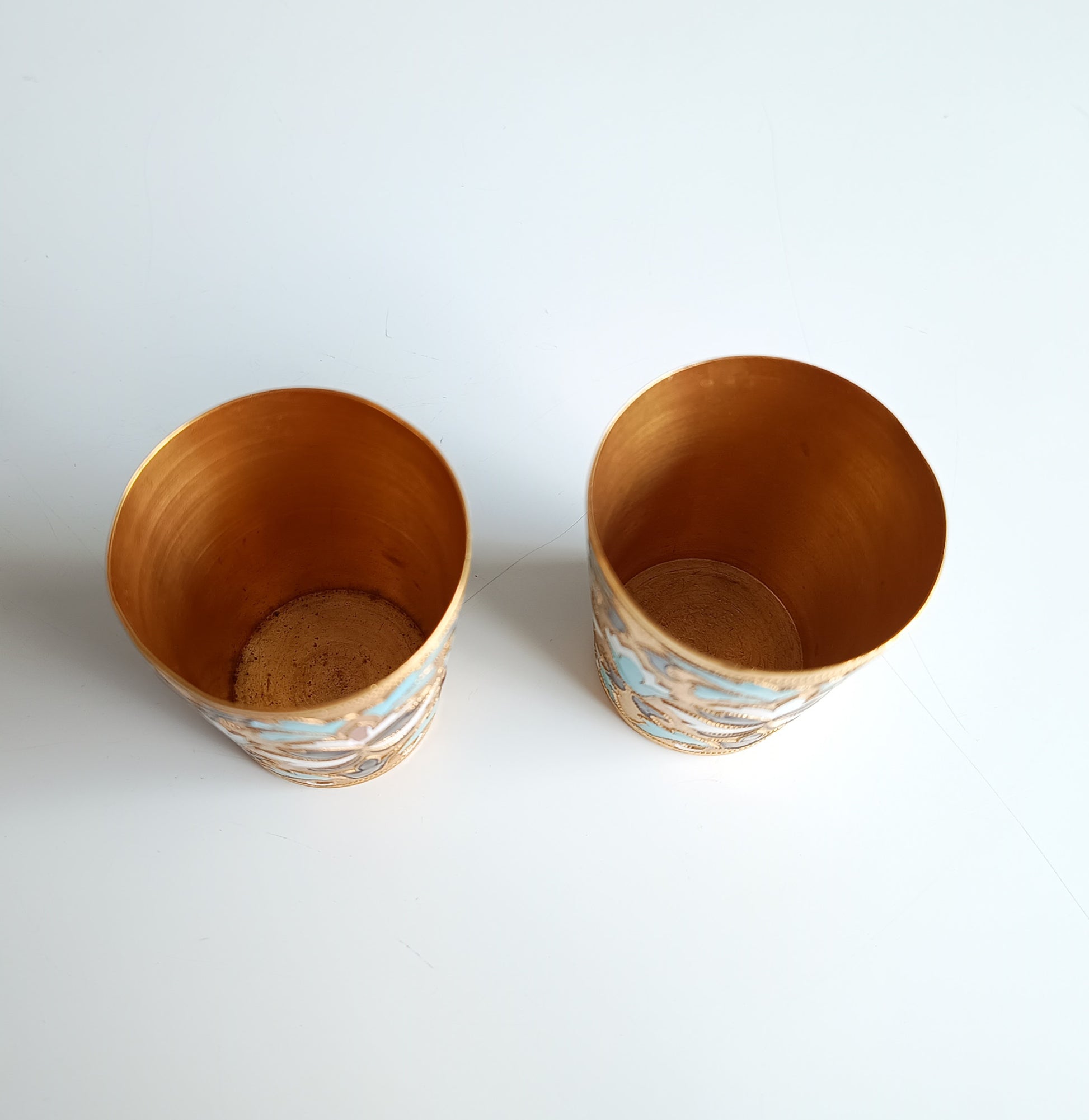 The beakers are incredibly ornate and decorated in the traditional Russian Fabergé style of cloisonne hot enamelling over metal. The base metal here is brass.