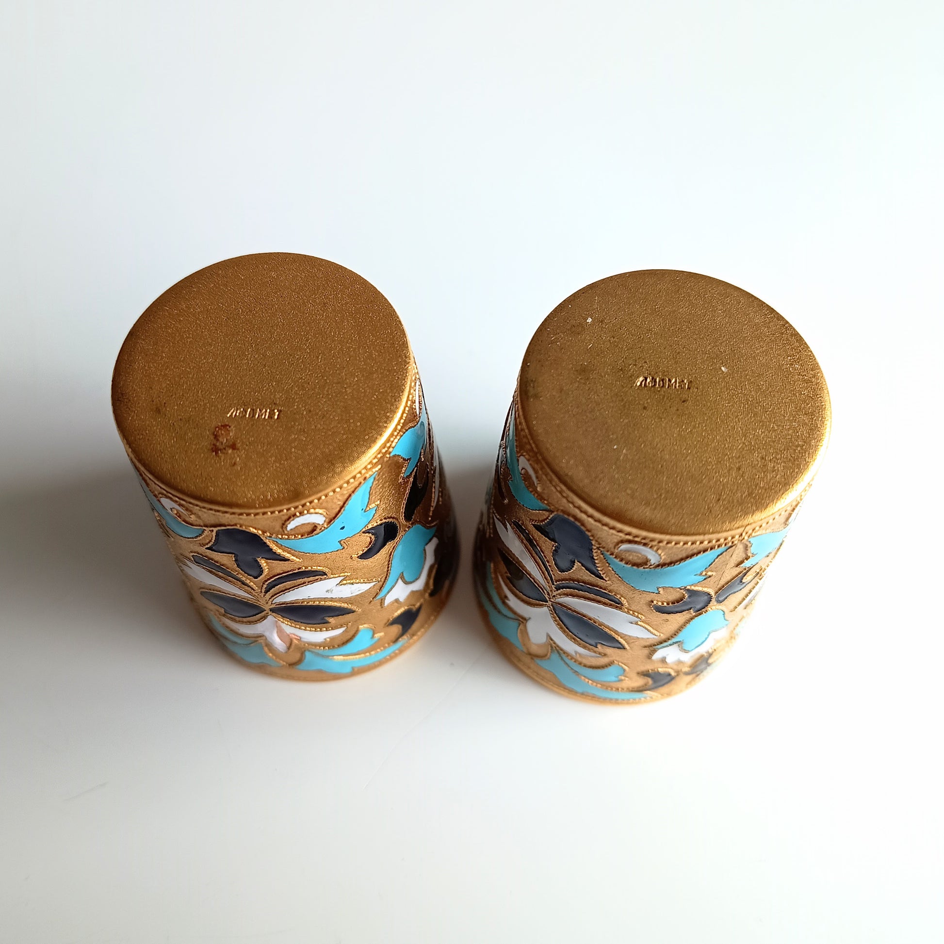 Vintage Russian USSR Cloisonne Enamelled Gilt Brass Fabergé Style Shot Glasses Beakers by Leningrad Jewellery Factory 1960s