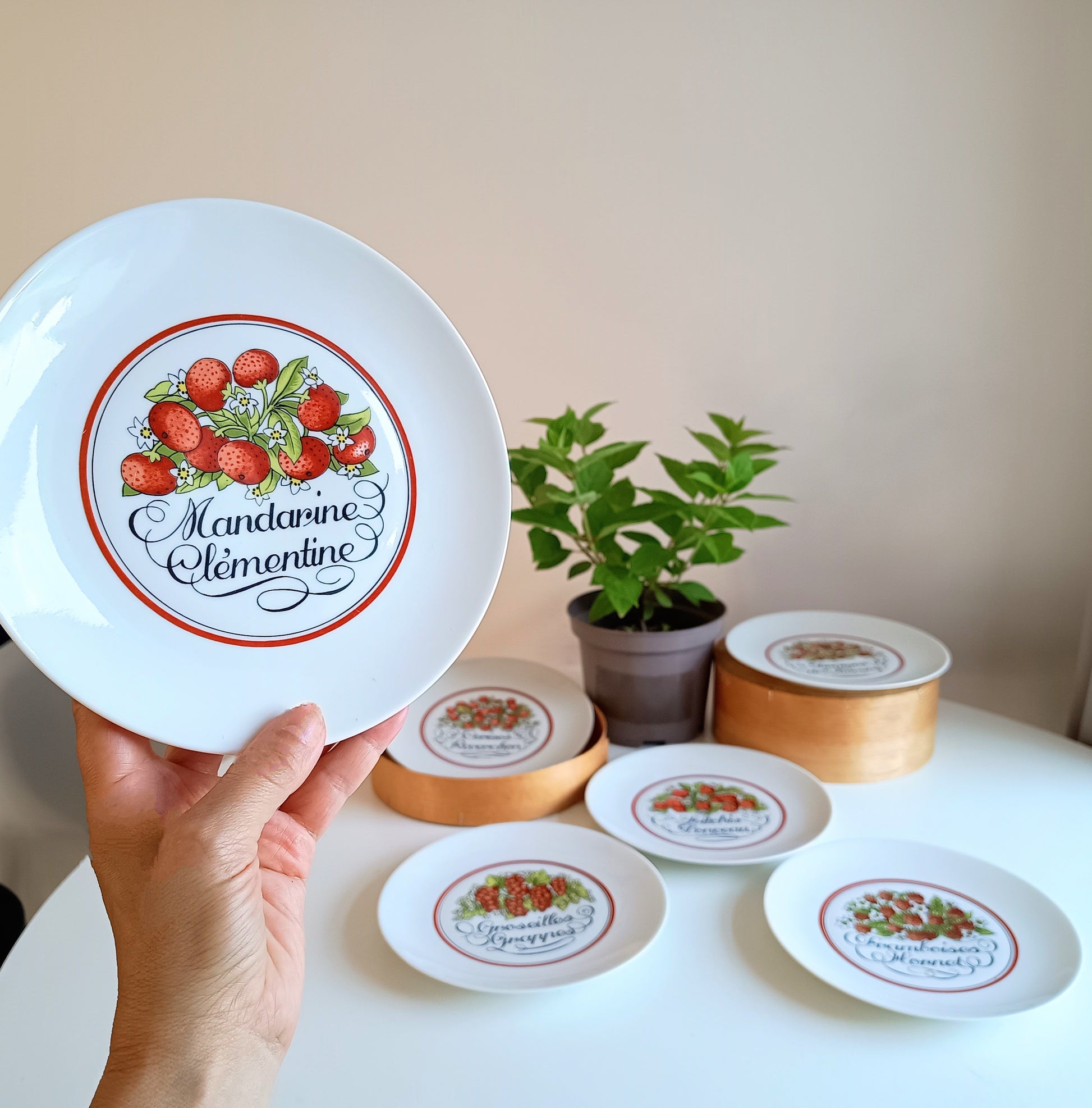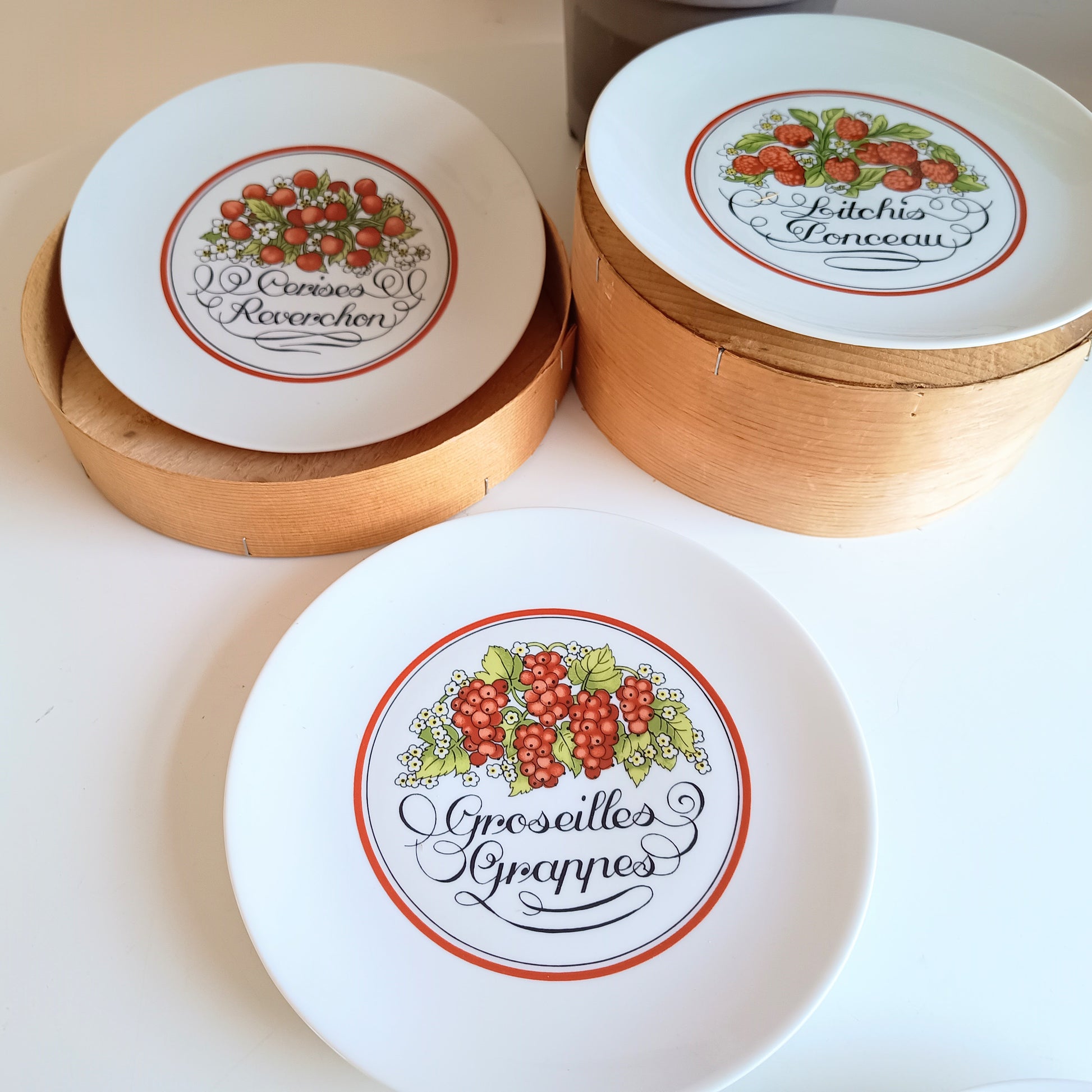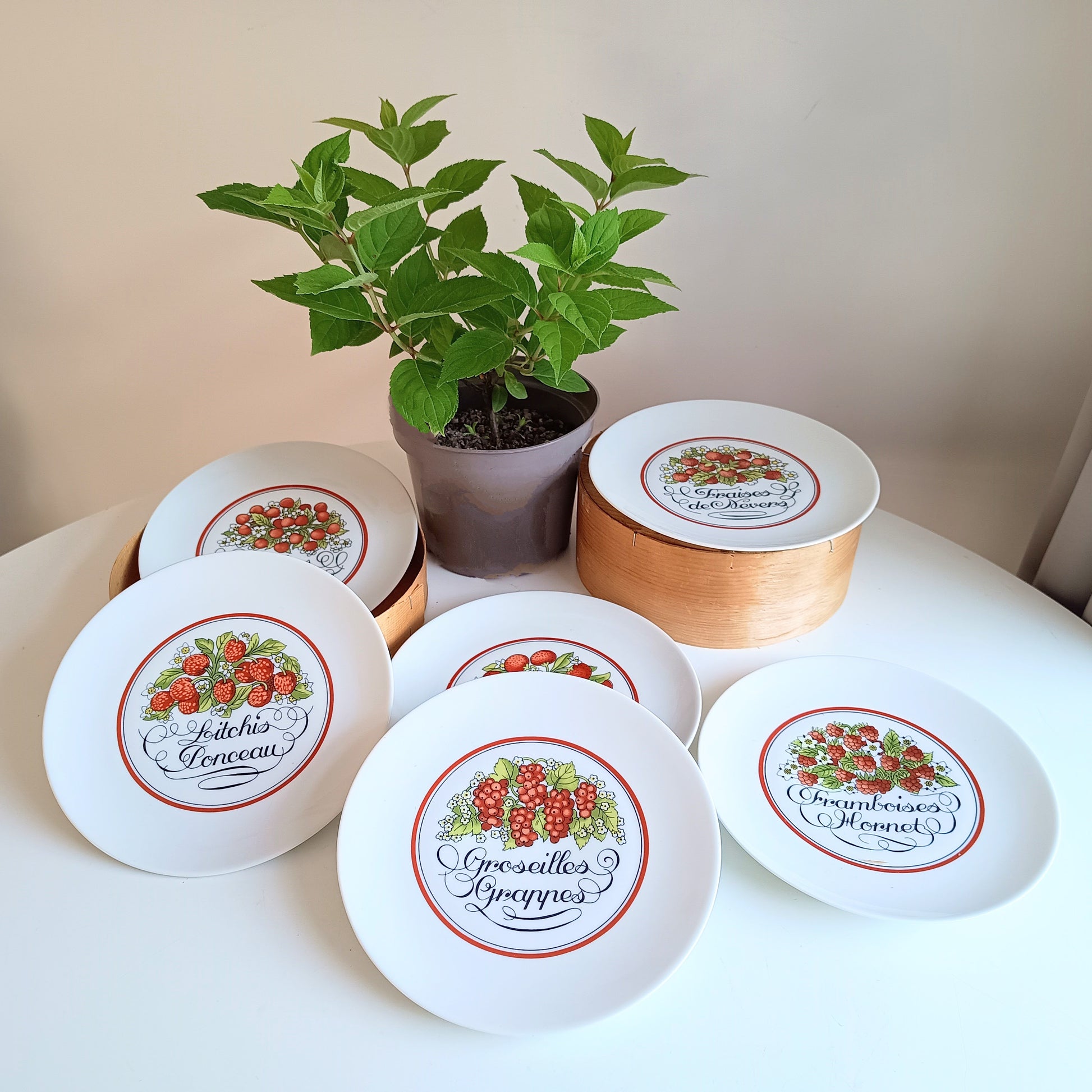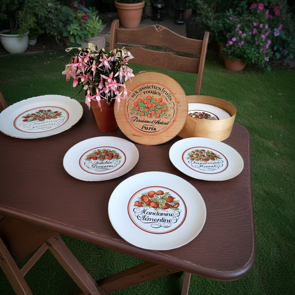 1970s Boxed French Vintage Porcelain Plates Red Fruits Porcelaine D'Auteuil