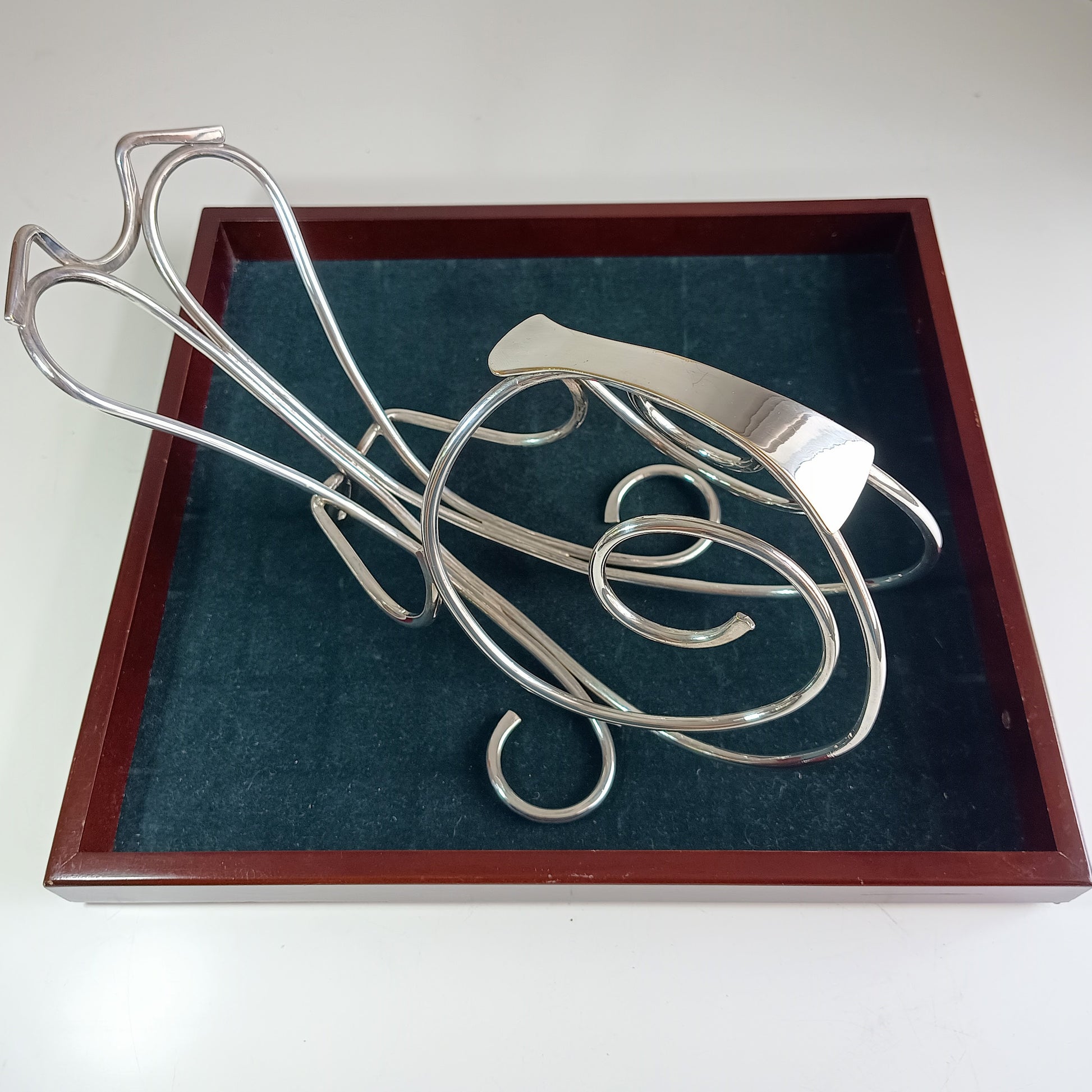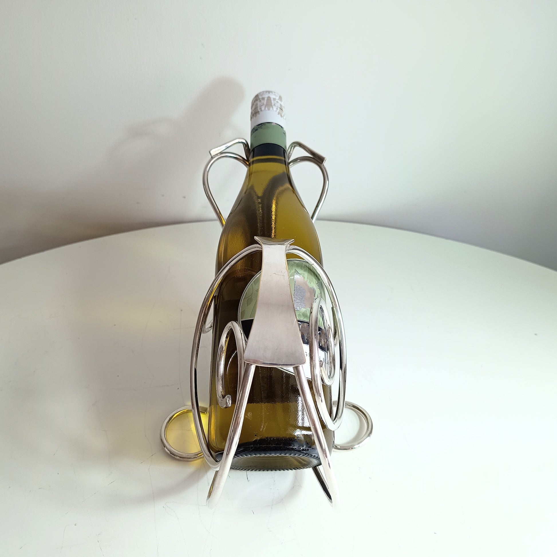 Chic and elegant vintage silver-plated wine cradle, uniquely crafted in a stylized snail form. This sculptural piece combines practical functionality with artful design, making it a stunning addition to any bar, dining room, or display shelf.