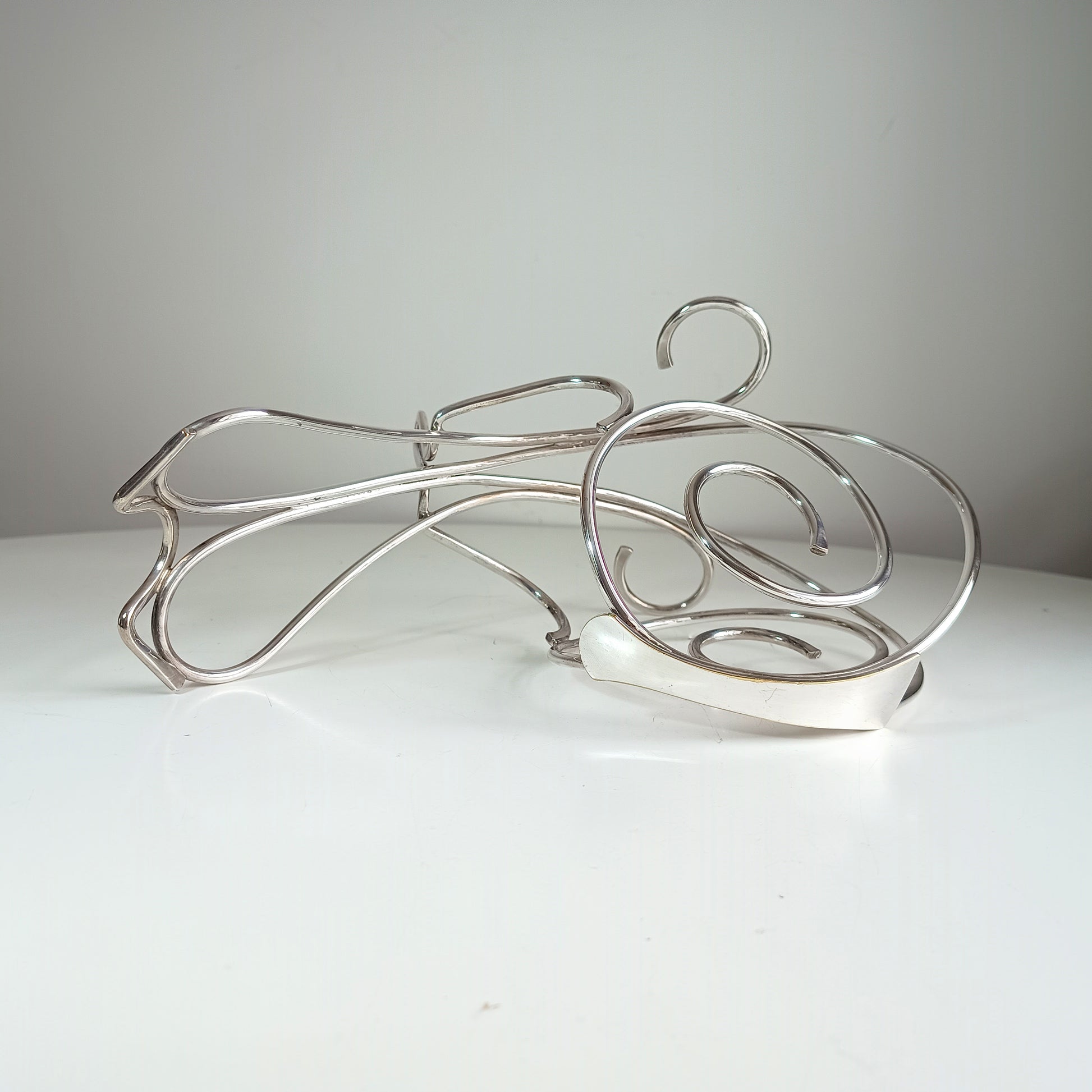 Crafted in brass with a silver-plated finish, the cradle features smooth, rounded rods that taper and flatten gracefully toward the feet and edges—demonstrating high craftsmanship and attention to detail. The integrated slinky-style handle on top adds a distinctive, whimsical flair.